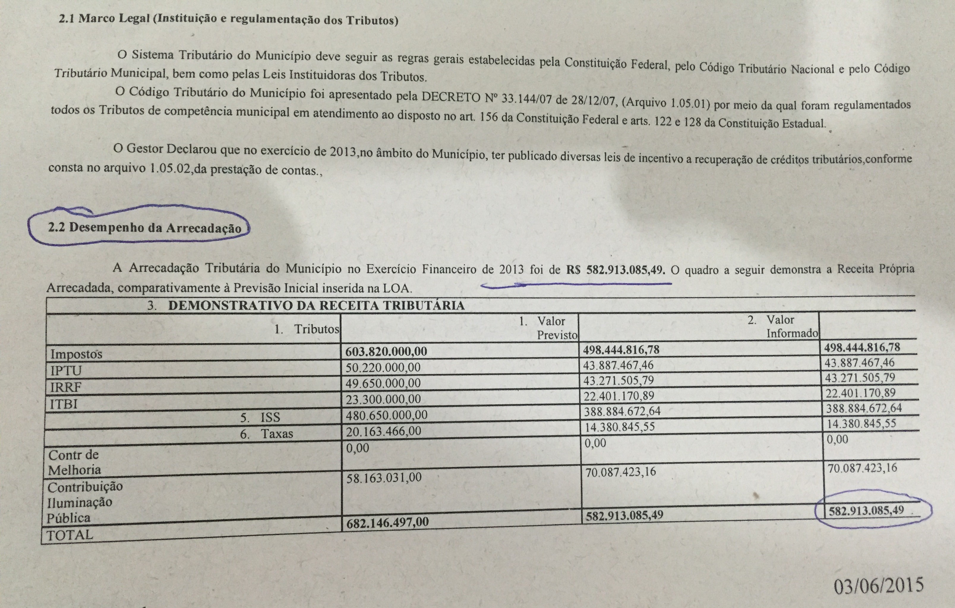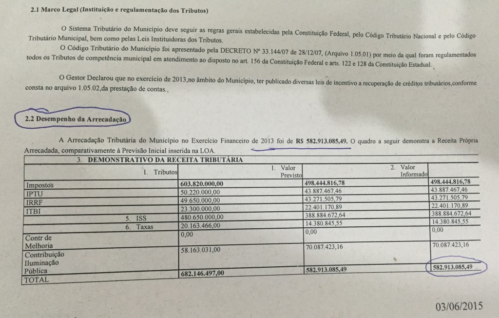 O cruzamento feito pelo TCE, com base em dados da prestação de contas do município, também revelou que, em 2013, teve uma arrecadação tributária de mais de 582 milhões, conforme mostra abaixo o quadro de demonstrativo da Receita Própria.
